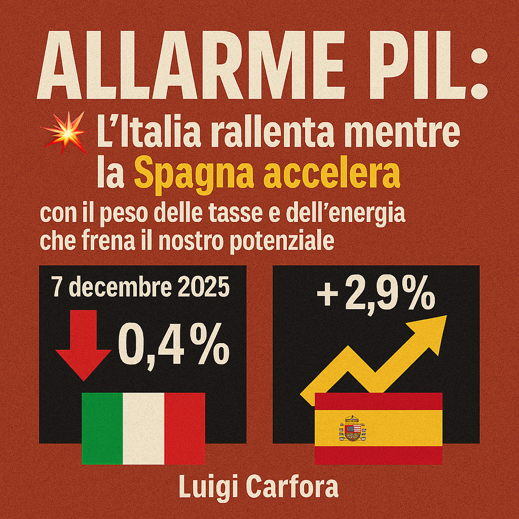 Alla data del 7 dicembre 2025, i dati indicano che il PIL dell'Italia crescerà solo dello 0,4% (secondo la Commissione Europea), mentre la Spagna punta a un +2,9%. Questa divergenza non è solo una questione di dinamiche occupazionali o produttività: ci sono due zavorre economiche molto concrete che spesso non vengono messe al centro del dibattito come dovrebbero, ma che condizionano pesantemente la crescita.